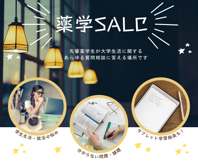 大学の講義内容は高校よりも格段にレベルアップし、講義についていくためには講義外での自学自習がとても大切です。本学では、新しい講義棟やサファイアカフェスペースだけでなく、学部図書室、研究棟オープンスペースなど快適に自習できる場所が沢山あります。講義が開講される日は、是非大学に残って自学自習の時間をとりましょう。しかし、自習していてると分からないことも出てきます。そんな時、気軽に質問できる場所があったら良いと思いませんか?薬学SALCはそのような場所を提供しています。薬学SALCでは薬学部の先輩や教員が学習相談にのり、分からないところを一緒に考えてくれます。1人で学習していては大変に感じることも、志を同じくする学生同士で教え合い、学びあうことで楽しく学習を進めることができると思います。